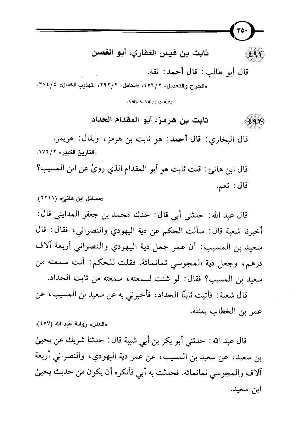 قال عبد اللَّه: حدثني أبي قال: حدثنا محمد بن جعفر المدايني قال: أخبرنا شعبة قال: سألت الحكم عن دية اليهودي والنصراني، فقال؟ قال سعيد بن المسيب: أن عمر جعل دية اليهودي والنصراني أربعة آلاف درهم، وجعل دية المجوسي ثمانمائة. فقلت للحكم: أنت سمعته من سعيد بن المسيب؟ فقال: لو شئت لسمعته، سمعته من ثابت الحداد.