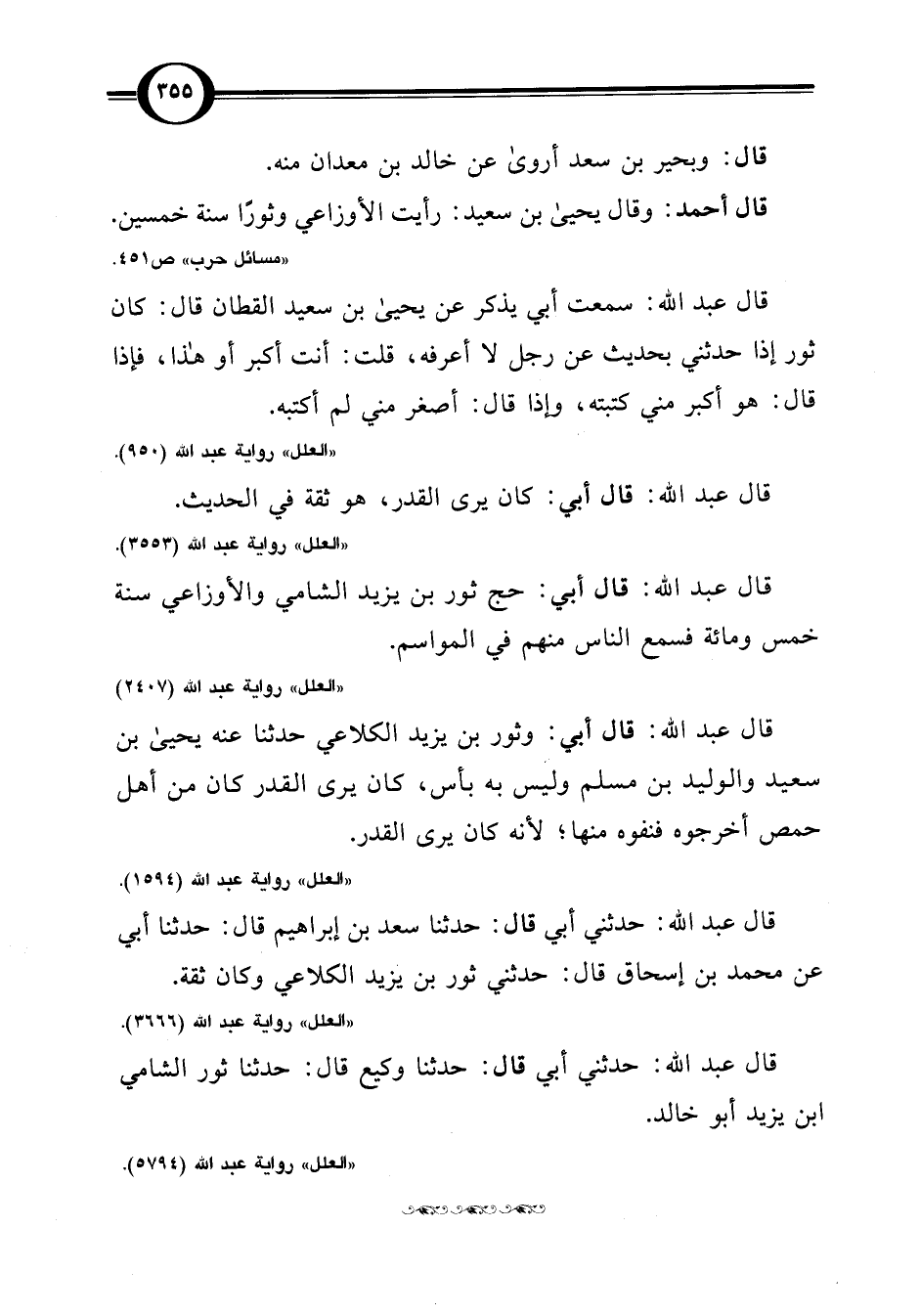 قال عبد اللَّه: حدثني أبي قال: حدثنا سعد بن إبراهيم قال: حدثنا أبي عن محمد بن إسحاق قال: حدثني ثور بن يزيد الكلاعي وكان ثقة.