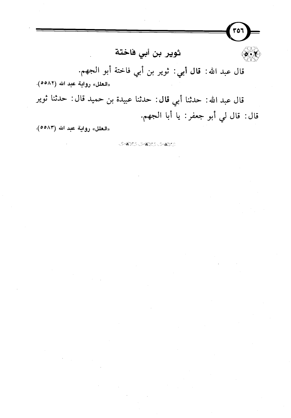 قال عبد اللَّه: حدثنا أبي قال: حدثنا عبيدة بن حميد قال: حدثنا ثوير قال: قال لي أبو جعفر: يا أبا الجهم.