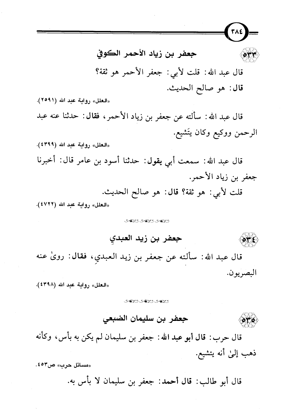 قال عبد اللَّه: سألته عن جعفر بن زياد الأحمر، فقال: حدثنا عنه عبد الرحمن ووكيع وكان يتَشيع.