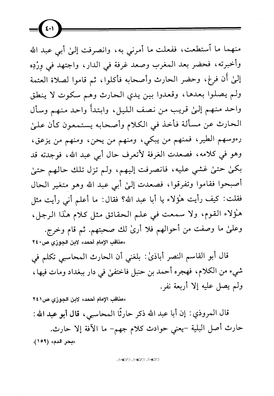 قال المروذي: إن أبا عبد اللَّه ذكر حارثًا المحاسبي، قال أبو عبد اللَّه: حارث أصل البلية -يعني حوادث كلام جهم- ما الآفة إلا حارث.