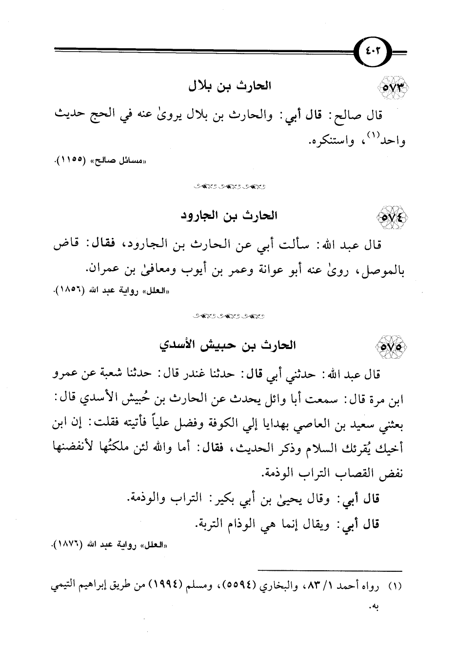 قال صالح: قال أبي: والحارث بن بلال يروى عنه في الحج حديث واحد (¬1)، واستنكره.