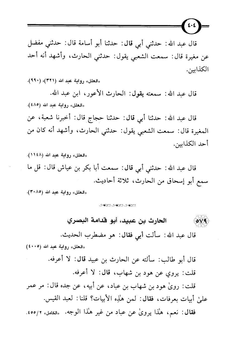 قال عبد اللَّه: حدثني أبي قال: حدثنا أبو أسامة قال: حدثني مفضل عن مغيرة قال: سمعت الشعبي يقول: حدثني الحارث، وأشهد أنه أحد الكذابين.
