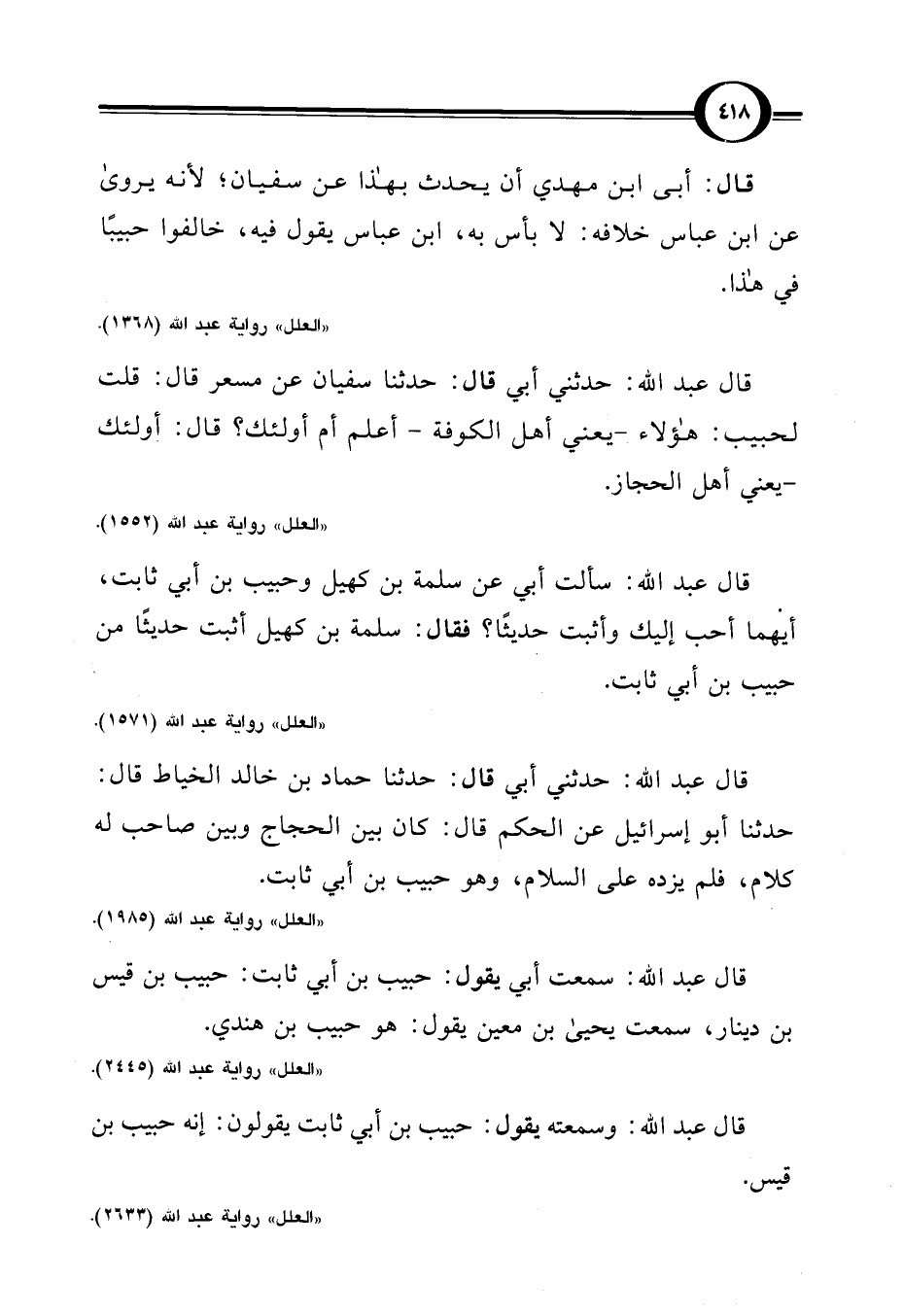 قال عبد اللَّه: حدثني أبي قال: حدثنا سفيان عن مسعر قال: قلت لحبيب: هؤلاء -يعني أهل الكوفة- أعلم أم أولئك؟ قال: أولئك -يعني أهل الحجاز.