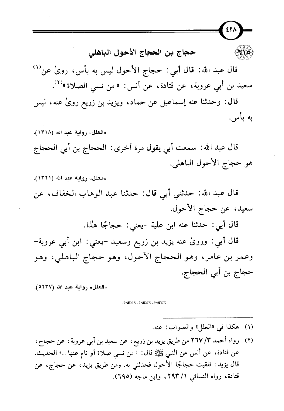 قال عبد اللَّه: قال أبي: حجاج الأحول ليس به بأس، روى عن (¬1) سعيد بن أبي عروبة، عن قتادة، عن أنس: "من نسي الصلاة" (¬2).