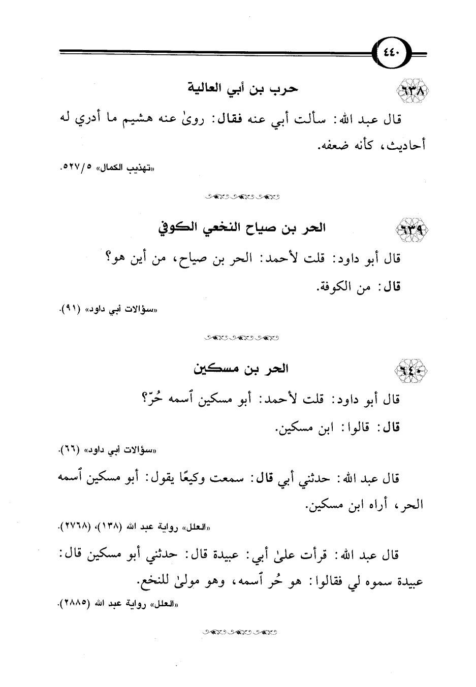 قال عبد اللَّه: قرأت على أبي: عبيدة قال: حدثني أبو مسكين قال: عبيدة سموه لي فقالوا: هو حُر اسمه، وهو مولى للنخع.