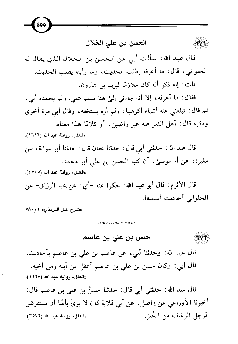 قال عبد اللَّه: سألت أبي عن الحسن بن الخلال الذي يقال له الحلواني، قال: ما أعرفه يطلب الحديث، وما رأيته يطلب الحديث.