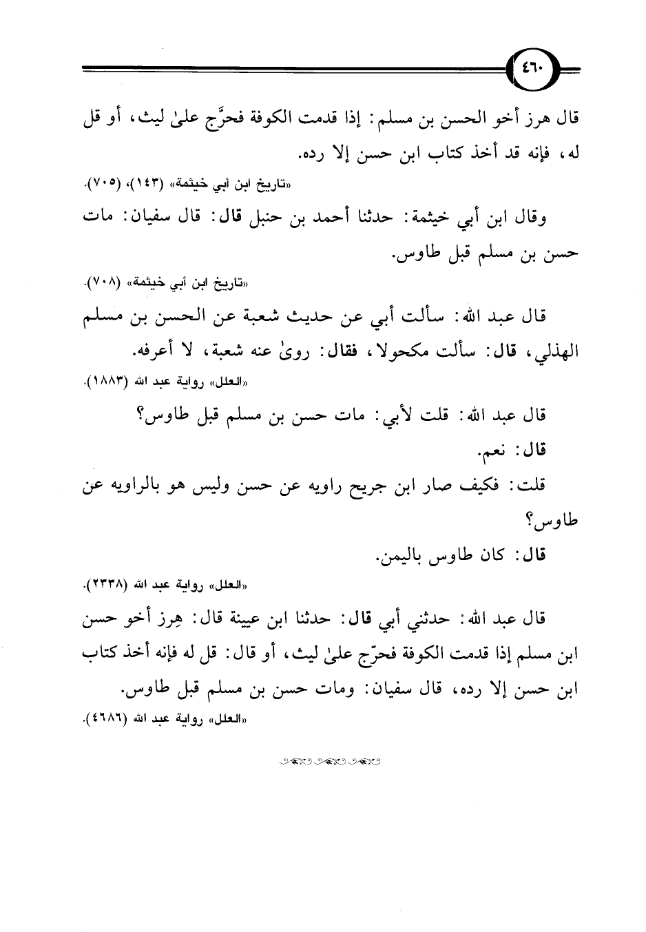 قال عبد اللَّه: حدثني أبي قال: حدثنا ابن عيينة قال: هِرز أخو حسن ابن مسلم إذا قدمت الكوفة فحرّج على ليث، أو قال: قل له فإنه أخذ كتاب ابن حسن إلا رده، قال سفيان: ومات حسن بن مسلم قبل طاوس.