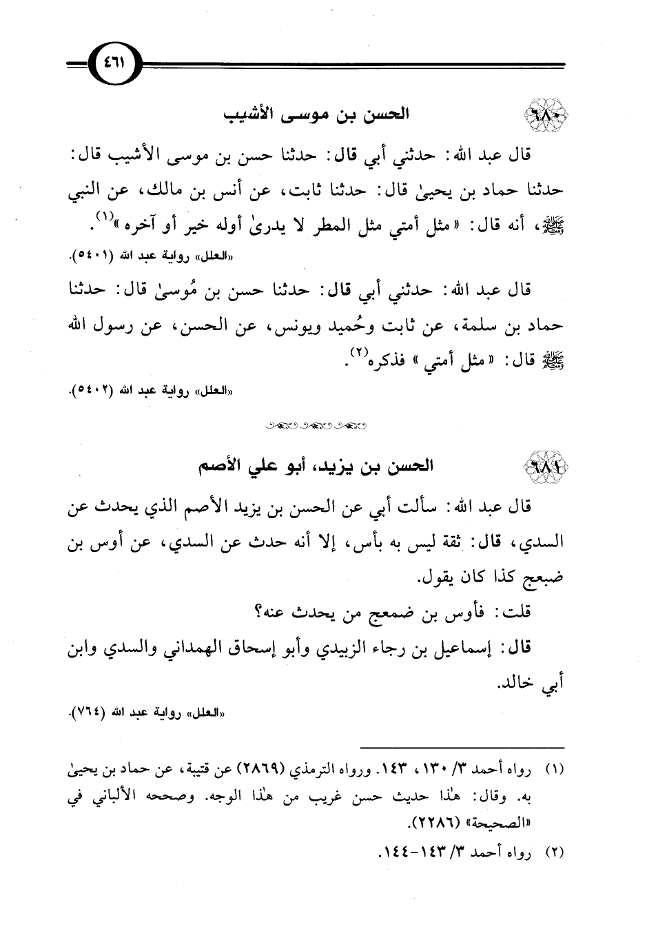 قال عبد اللَّه: حدثني أبي قال: حدثنا حسن بن مُوسى قال: حدثنا حماد بن سلمة، عن ثابت وحُميد ويونس، عن الحسن، عن رسول اللَّه -صلى اللَّه عليه وسلم- قال: "مثل أمتي" فذكره (¬2).