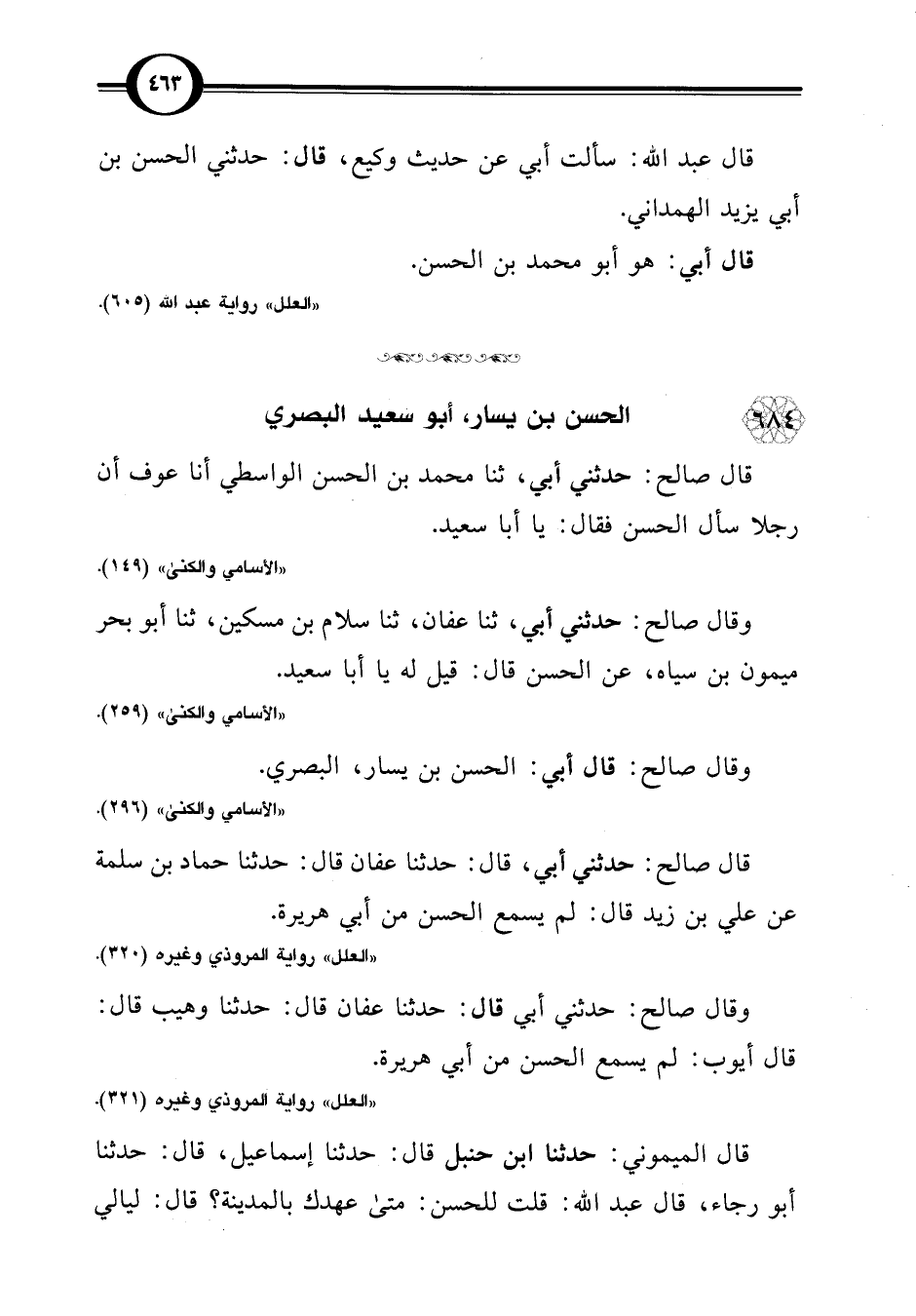 قال صالح: حدثني أبي، ثنا محمد بن الحسن الواسطي أنا عوف أن رجلا سأل الحسن فقال: يا أبا سعيد.