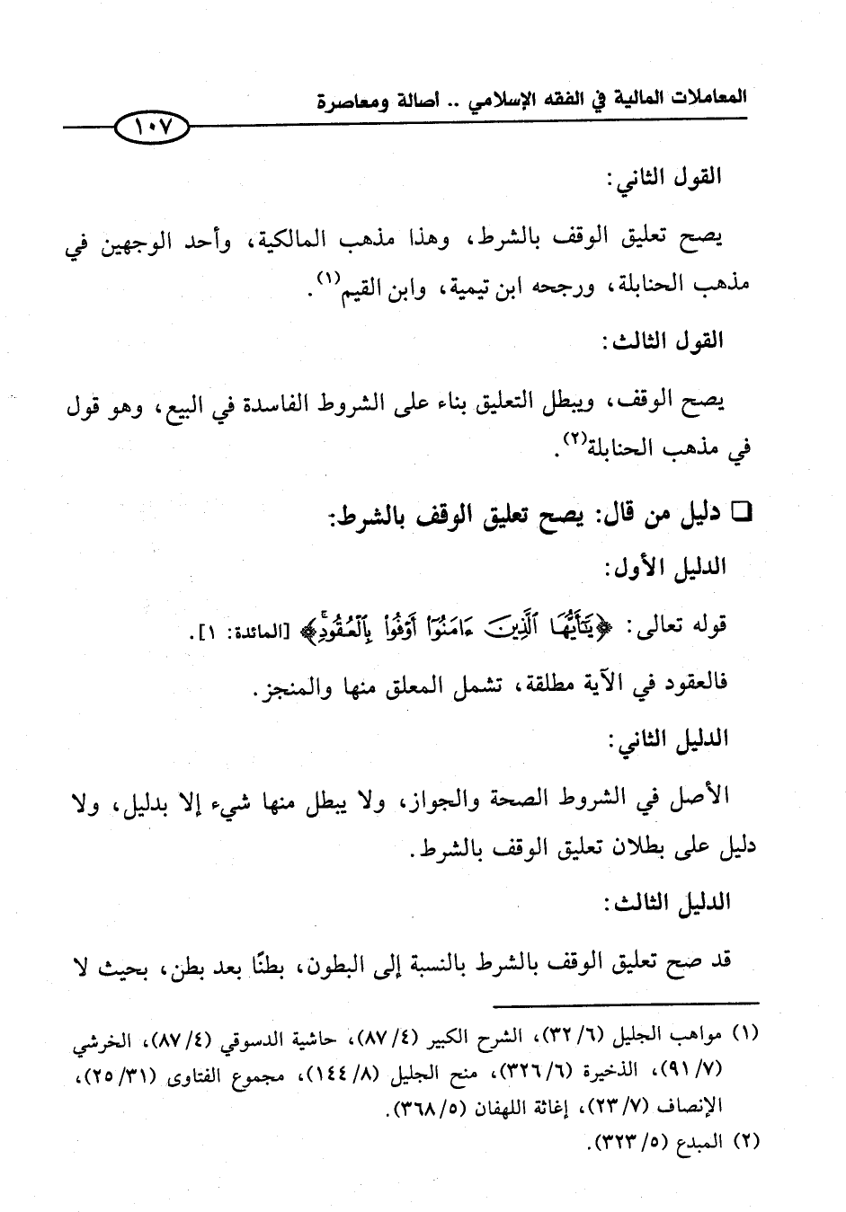 يصح تعليق الوقف بالشرط، وهذا مذهب المالكية، وأحد الوجهين في مذهب الحنابلة، ورجحه ابن تيمية، وابن القيم (¬١).