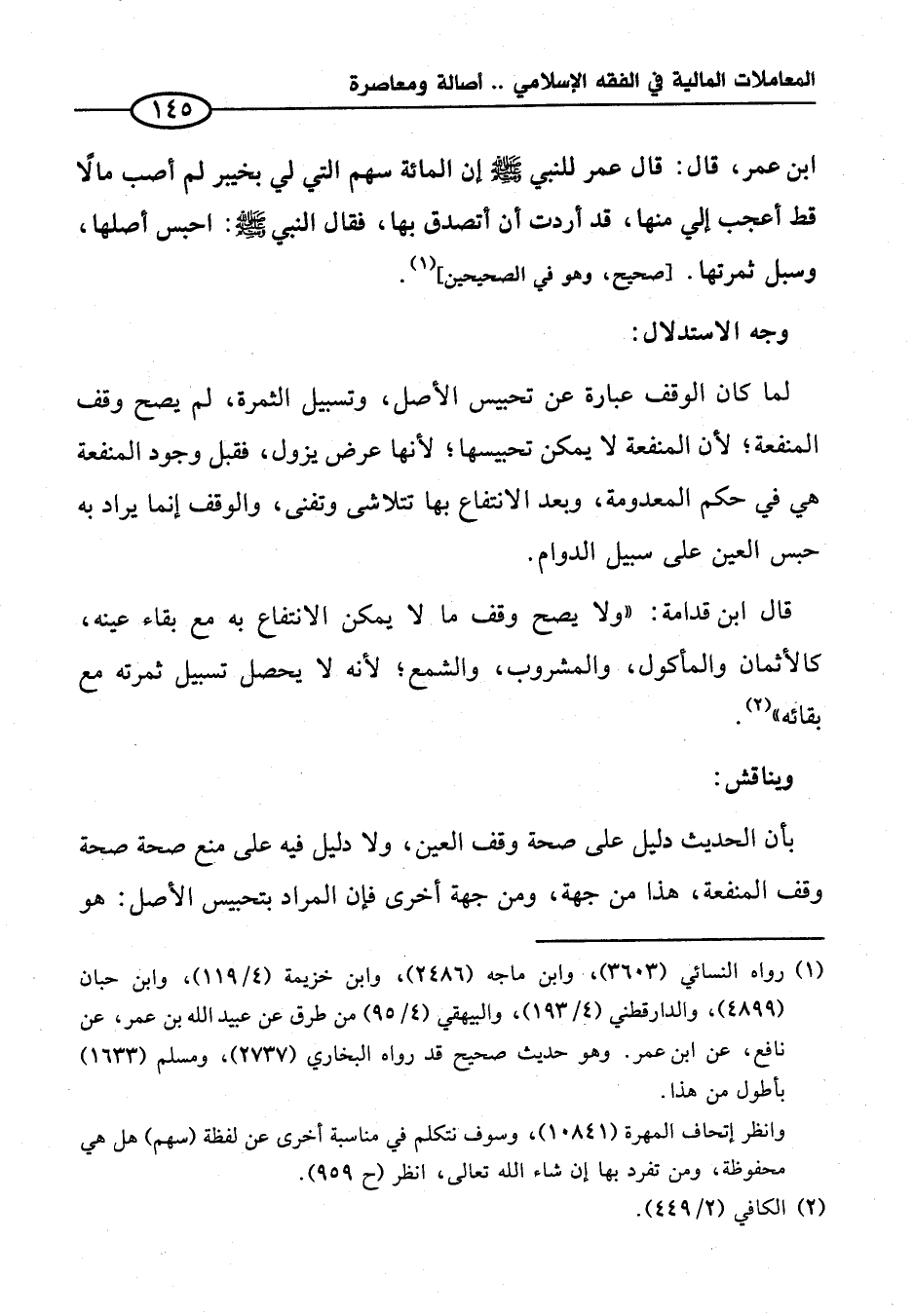 ابن عمر، قال: قال عمر للنبي - صلى الله عليه وسلم - إن المائة سهم التي لي بخيبر لم أصب مالًا قط أعجب إلي منها، قد أردت أن أتصدق بها، فقال النبي - صلى الله عليه وسلم -: احبس أصلها، وسبل ثمرتها. أصحيح، وهو في الصحيحين (¬١).