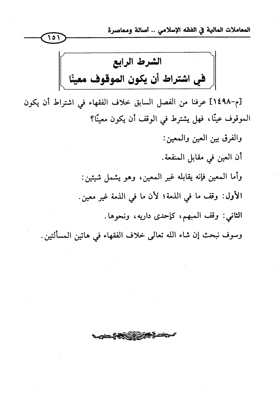 [م - ١٤٩٨] عرفنا من الفصل السابق خلاف الفقهاء في اشتراط أن يكون الموقوف عينا، فهل يشترط في الوقف أن يكون معينا؟