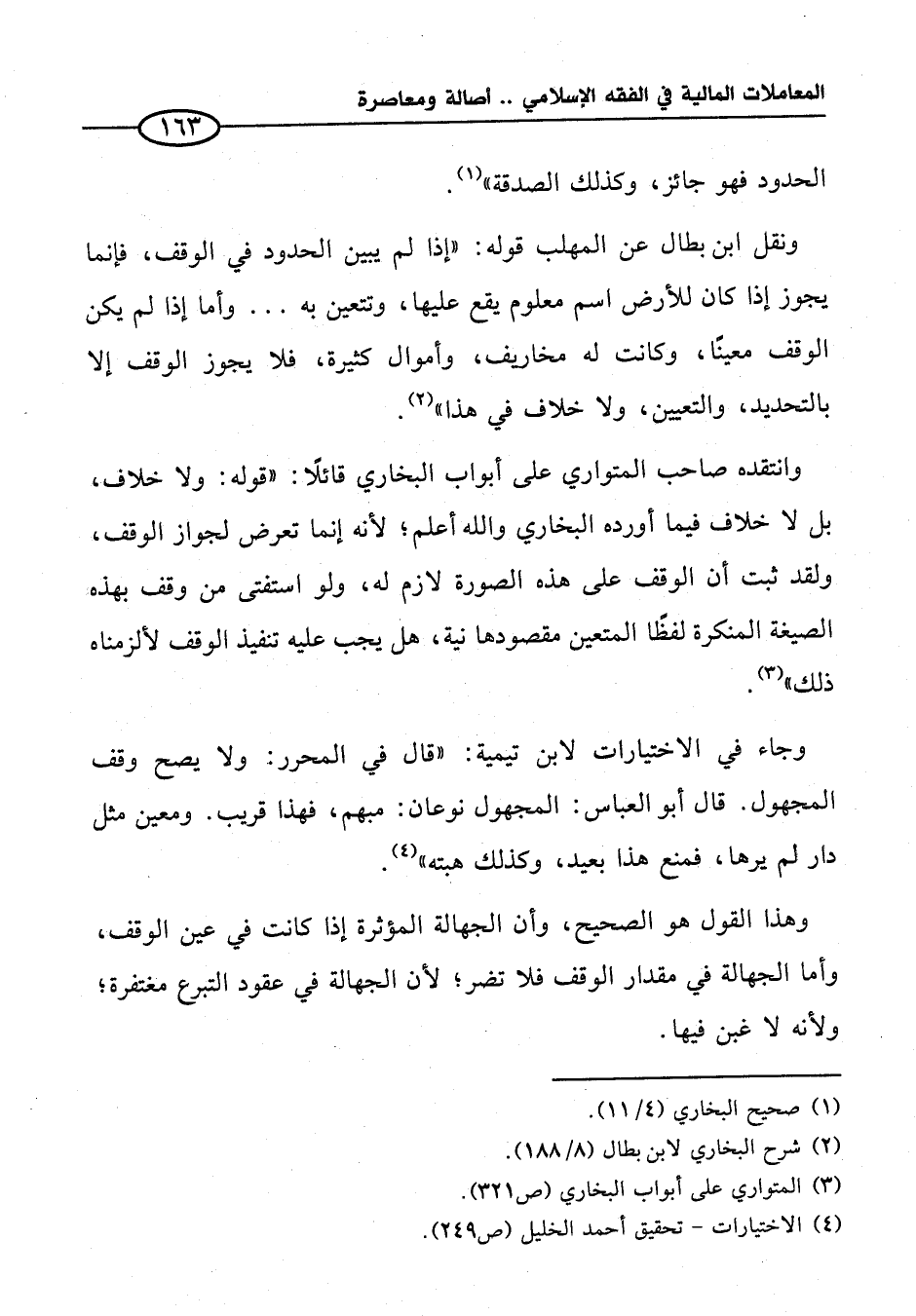ونقل ابن بطال عن المهلب قوله: "إذا لم يبين الحدود في الوقف، فإنما يجوز إذا كان للأرض اسم معلوم يقع عليها، وتتعين به ... وأما إذا لم يكن الوقف معينًا، وكانت له مخاريف، وأموال كثيرة، فلا يجوز الوقف إلا بالتحديد، والتعيين، ولا خلاف في هذا" (¬٢).