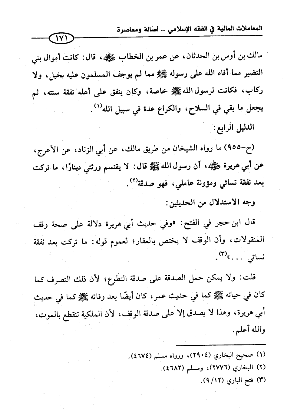 قلت: ولا يمكن حمل الصدقة على صدقة التطوع؛ لأن ذلك التصرف كما كان في حياته - صلى الله عليه وسلم - كما في حديث عمر، كان أيضًا بعد وفاته " - صلى الله عليه وسلم - كما في حديث أبي هريرة، وهذا لا يصدق إلا على صدقة الوقف؛ لأن الملكية تنقطع بالموت، والله أعلم.