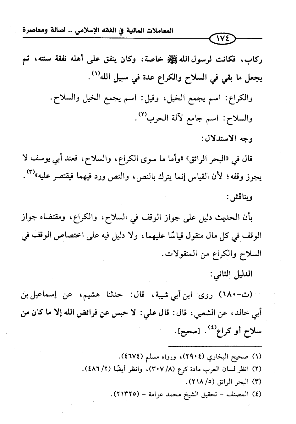 بأن الحديث دليل على جواز الوقف في السلاح، والكراع، ومقتضاه جواز الوقف في كل مال منقول قياسًا عليهما، ولا دليل فيه على اختصاص الوقف في السلاح والكراع من المنقولات.
