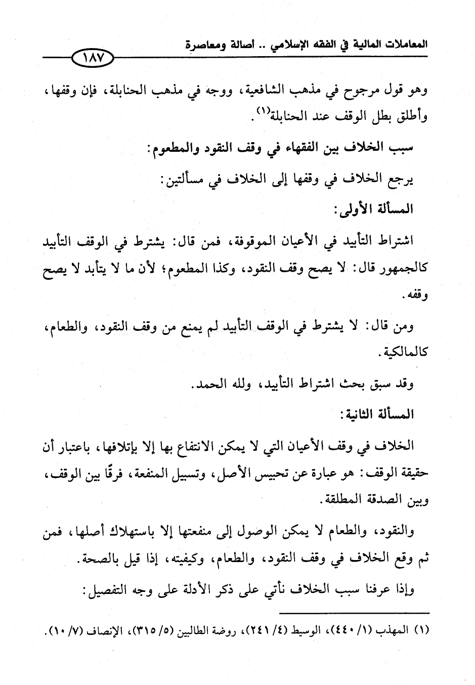 والنقود، والطعام لا يمكن الوصول إلى منفعتها إلا باستهلاك أصلها، فإن ثم وقع الخلاف في وقف النقود، والطعام، وكيفيته، إذا قيل بالصحة.