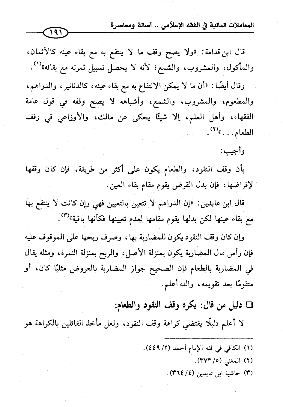 وقال أيضًا: "أن ما لا يمكن الانتفاع به مع بقاء عينه، كالدنانير، والدراهم، والمطعوم، والمشروب، والشمع، وأشباهه لا يصح وقفه في قول عامة الفقهاء، وأهل العلم، إلا شيئًا يحكى عن مالك، والأوزاعي في وقف الطعام ... " (¬٢).