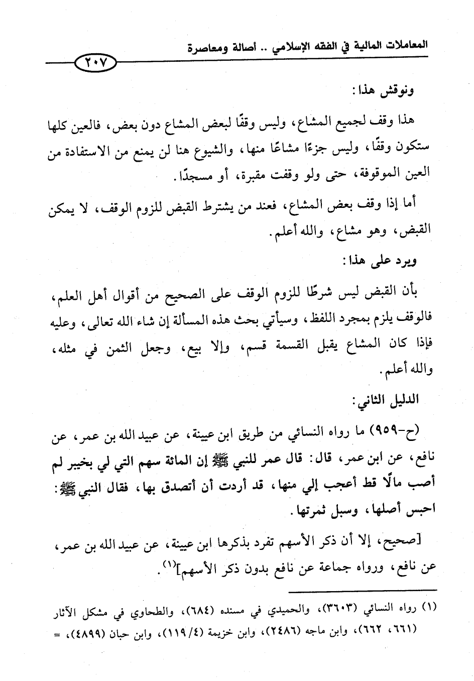 (ح -٩٥٩) ما رواه النسائي من طريق ابن عيينة، عن عبيد الله بن عمر، عن نافع، عن ابن عمر، قال: قال عمر للنبي - صلى الله عليه وسلم - إن المائة سهم التي لي بخيبر لم أصب مالًا قط أعجب إلي منها، قد أردت أن أتصدق بها، فقال النبي - صلى الله عليه وسلم -: احبس أصلها، وسبل ثمرتها.
