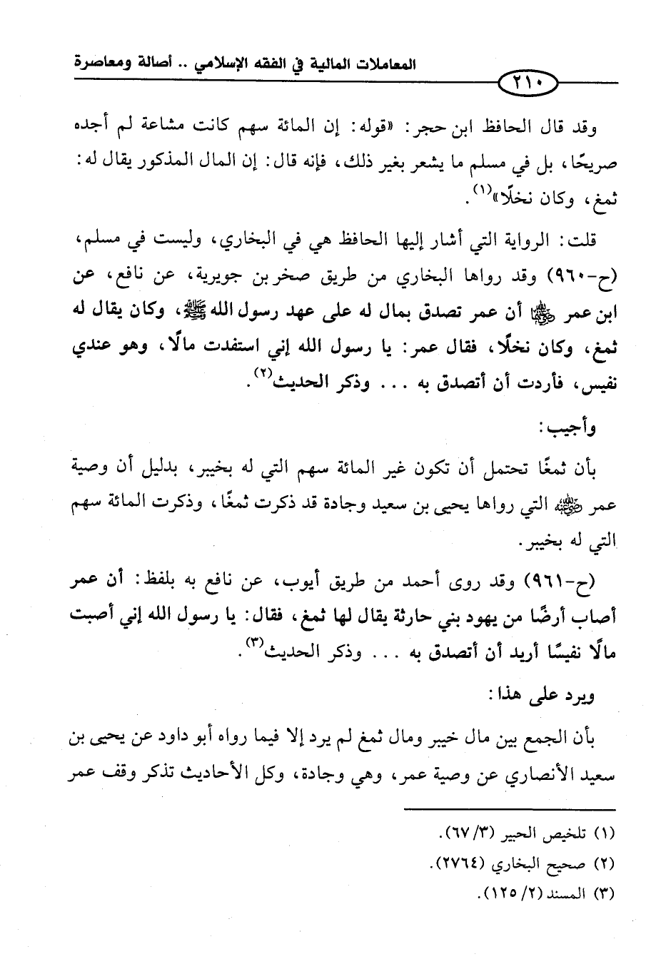 قلت: الرواية التي أشار إليها الحافظ هي في البخاري، وليست في مسلم، (ح -٩٦٠) وقد رواها البخاري من طريق صخر بن جويرية، عن نافع، عن ابن عمر - رضي الله عنهما - أن عمر تصدق بمال له على عهد رسول الله - صلى الله عليه وسلم -، وكان يقال له ثمغ، وكان نخلًا، فقال عمر: يا رسول الله إني استفدت مالًا، وهو عندي نفيس، فأردت أن أتصدق به ... وذكر الحديث (¬٢).