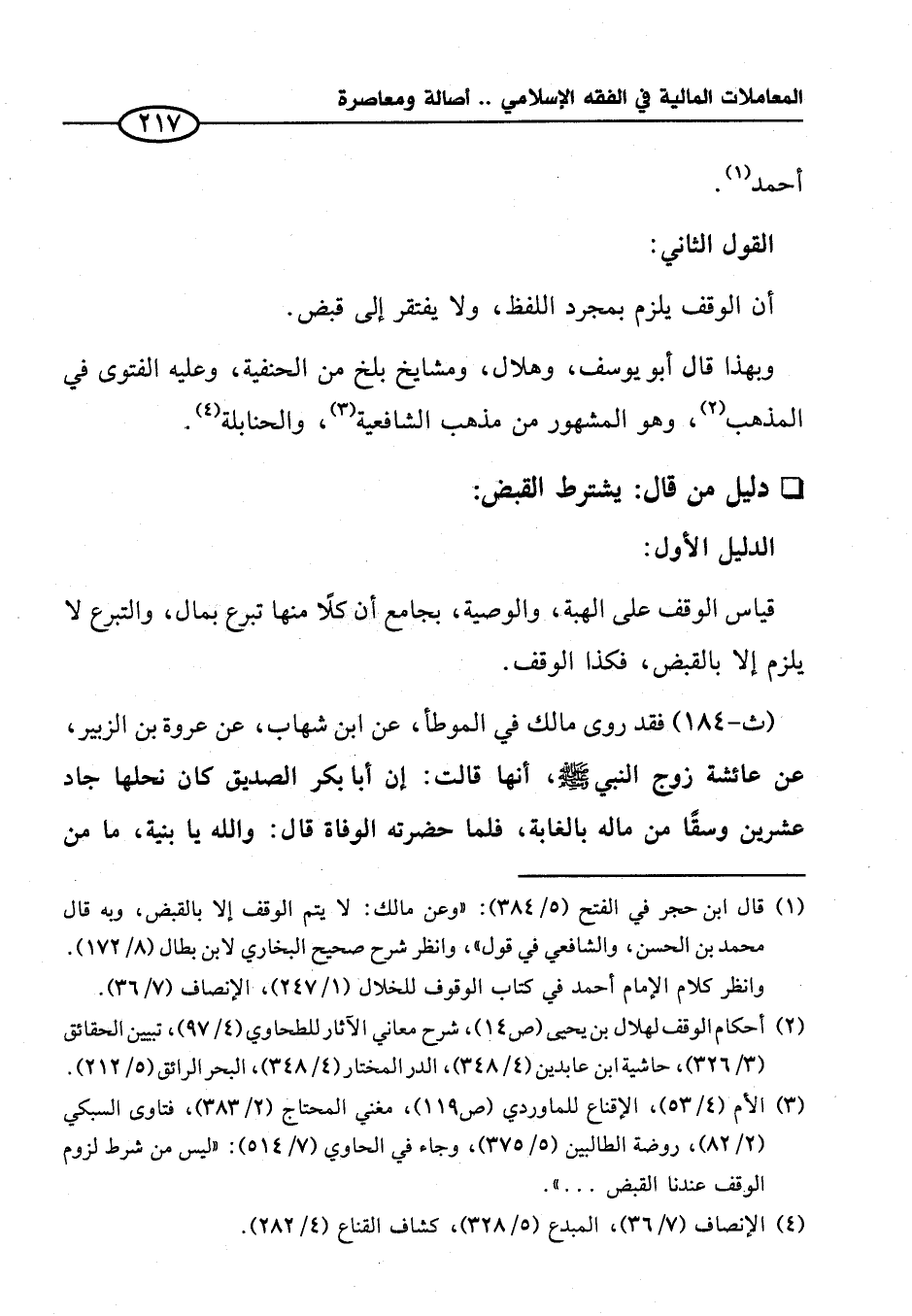 (¬٢) أحكام الوقف لهلال بن يحيى (ص ١٤)، شرح معاني الآثار للطحاوي (٤/ ٩٧)، تبيين الحقائق (٣/ ٣٢٦)، حاشية ابن عابدين (٤/ ٣٤٨)، الدر المختار (٤/ ٣٤٨)، البحر الرائق (٥/ ٢١٢).