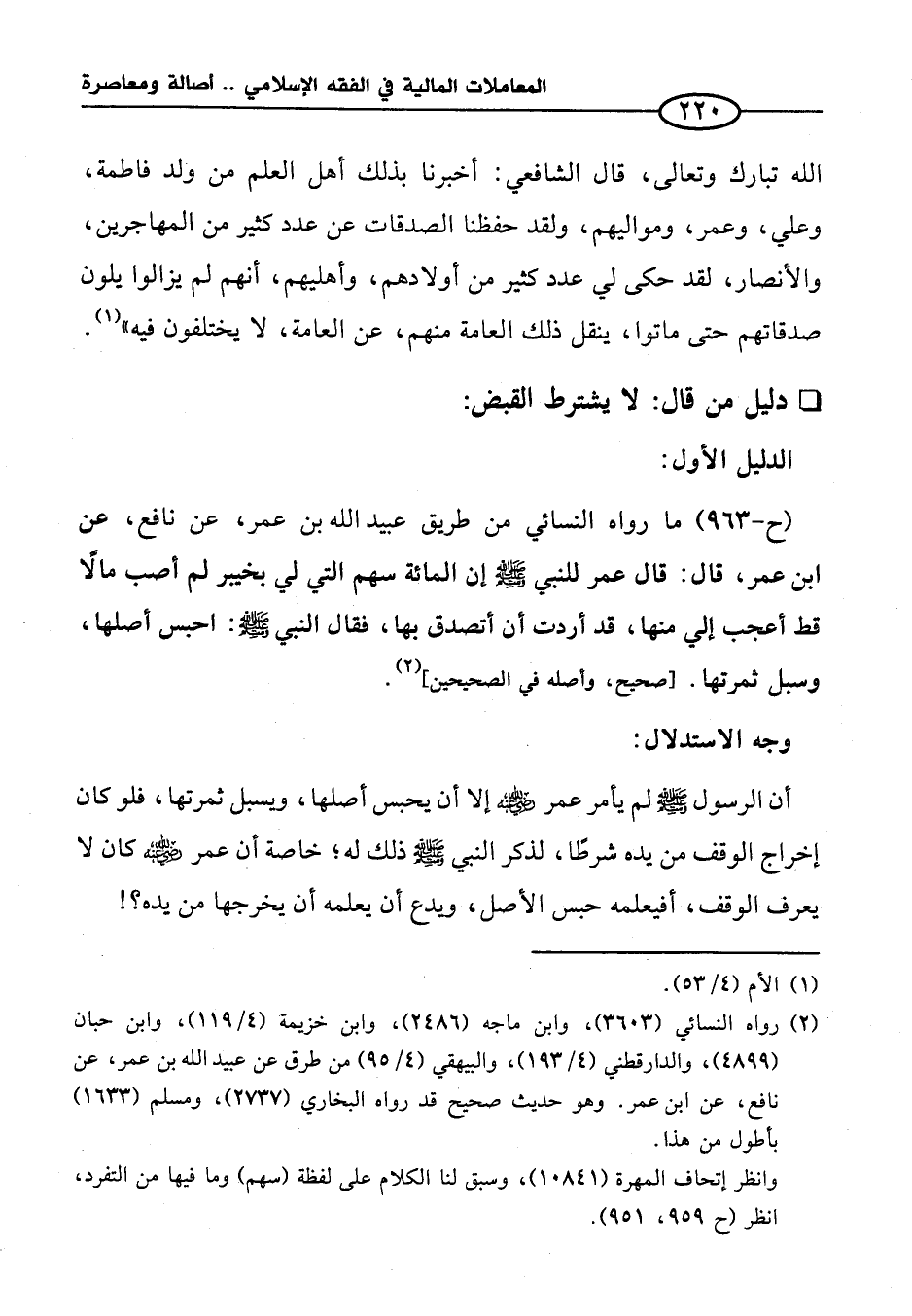 (ح -٩٦٣) ما رواه النسائي من طريق عبيد الله بن عمر، عن نافع، عن ابن عمر، قال: قال عمر للنبي - صلى الله عليه وسلم - إن المائة سهم التي لي بخيبر لم أصب مالًا قط أعجب إلى منها، قد أردت أن أتصدق بها، فقال النبي - صلى الله عليه وسلم -: احبس أصلها، وسبل ثمرتها. [صحيح، وأصله في الصحيحين] (¬٢).