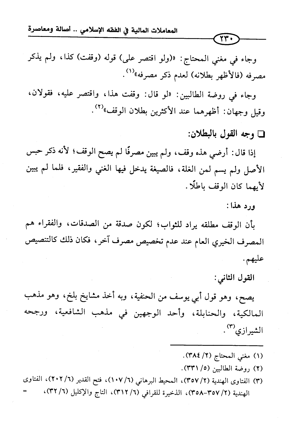 وجاء في مغني المحتاج: " (ولو اقتصر على) قوله (وقفت) كذا، ولم يذكر مصرفه (فالأظهر بطلانه) لعدم ذكر مصرفه" (¬١).