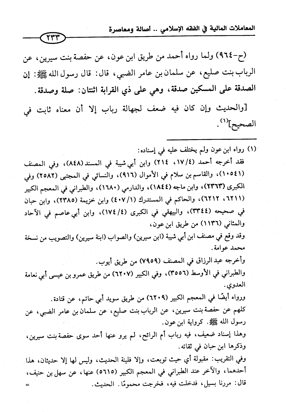 (ح -٩٦٤) ولما رواه أحمد من طريق ابن عون، عن حفصة بنت سيرين، عن الرباب بنت صليع، عن سلمان بن عامر الضبي، قال: قال رسول الله -صلى الله عليه وسلم -: إن الصدقة على المسكين صدقة، وهي على ذي القرابة اثنتان: صلة وصدقة.