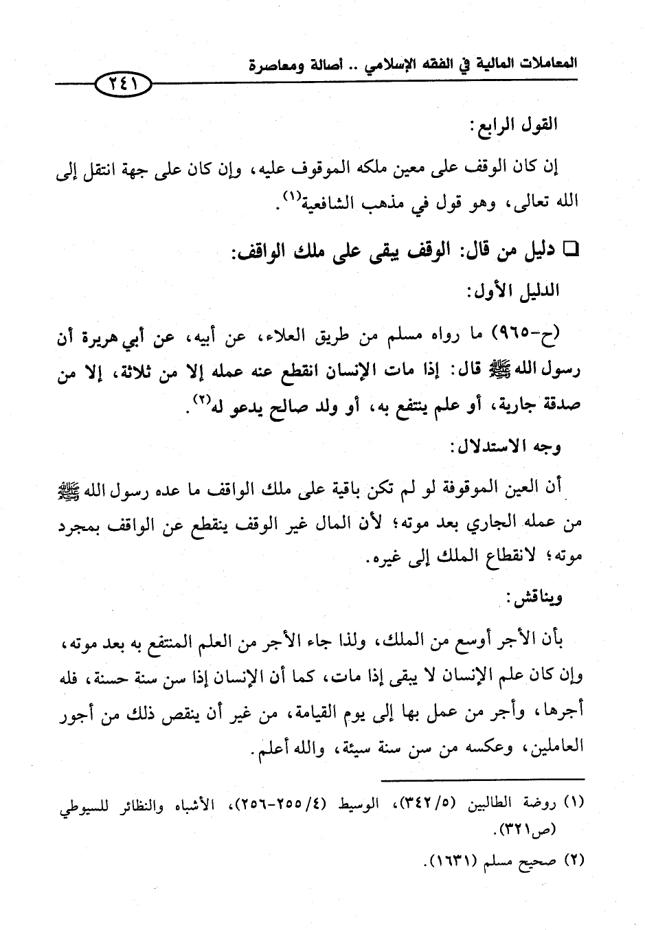 أن العين الموقوفة لو لم تكن باقية على ملك الواقف ما عده رسول الله -صلى الله عليه وسلم - من عمله الجاري بعد موته؛ لأن المال غير الوقف ينقطع عن الواقف بمجرد موته؛ لانقطاع الملك إلى غيره.