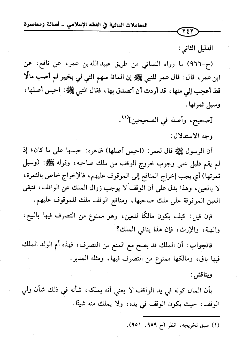 (ح -٩٦٦) ما رواه النسائي من طريق عبيد الله بن عمر، عن نافع، عن ابن عمر، قال: قال عمر للنبي - صلى الله عليه وسلم - إن المائة سهم التي لي بخيبر لم أصب مالًا قط أعجب إلي منها، قد أردت أن أتصدق بها، فقال النبي - صلى الله عليه وسلم -: احبس أصلها، وسبل ثمرتها.