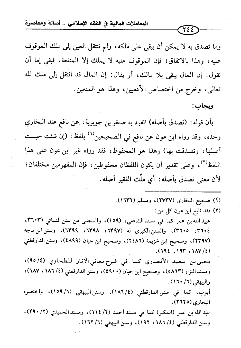 بأن قوله: (تصدق بأصله) انفرد به صخر بن جويرية، عن نافع عند البخاري وحده، وقد رواه ابن عون عن نافع في الصحيحين (¬١) بلفظ: (إن شئت حبست أصلها، وتصدقت بها) وهذا هو المحفوظ، فقد رواه غير ابن عون على هذا اللفظ (¬٢)، وعلى تقدير أن يكون اللفظان محفوظين، فإن المفهومين مختلفان؛ لأن معنى تصدق بأصله: أي ملِّك الفقير أصله.