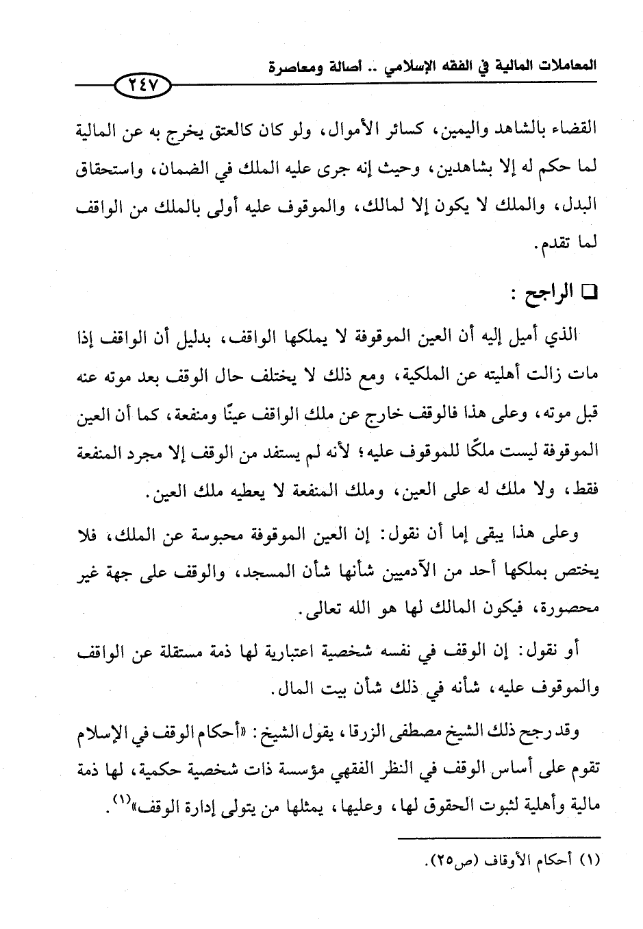 وقد رجح ذلك الشيخ مصطفى الزرقا، يقول الشيخ: "أحكام الوقف في الإِسلام تقوم على أساس الوقف في النظر الفقهي مؤسسة ذات شخصية حكمية، لها ذمة مالية وأهلية لثبوت الحقوق لها، وعليها، يمثلها من يتولى إدارة الوقف" (¬١).