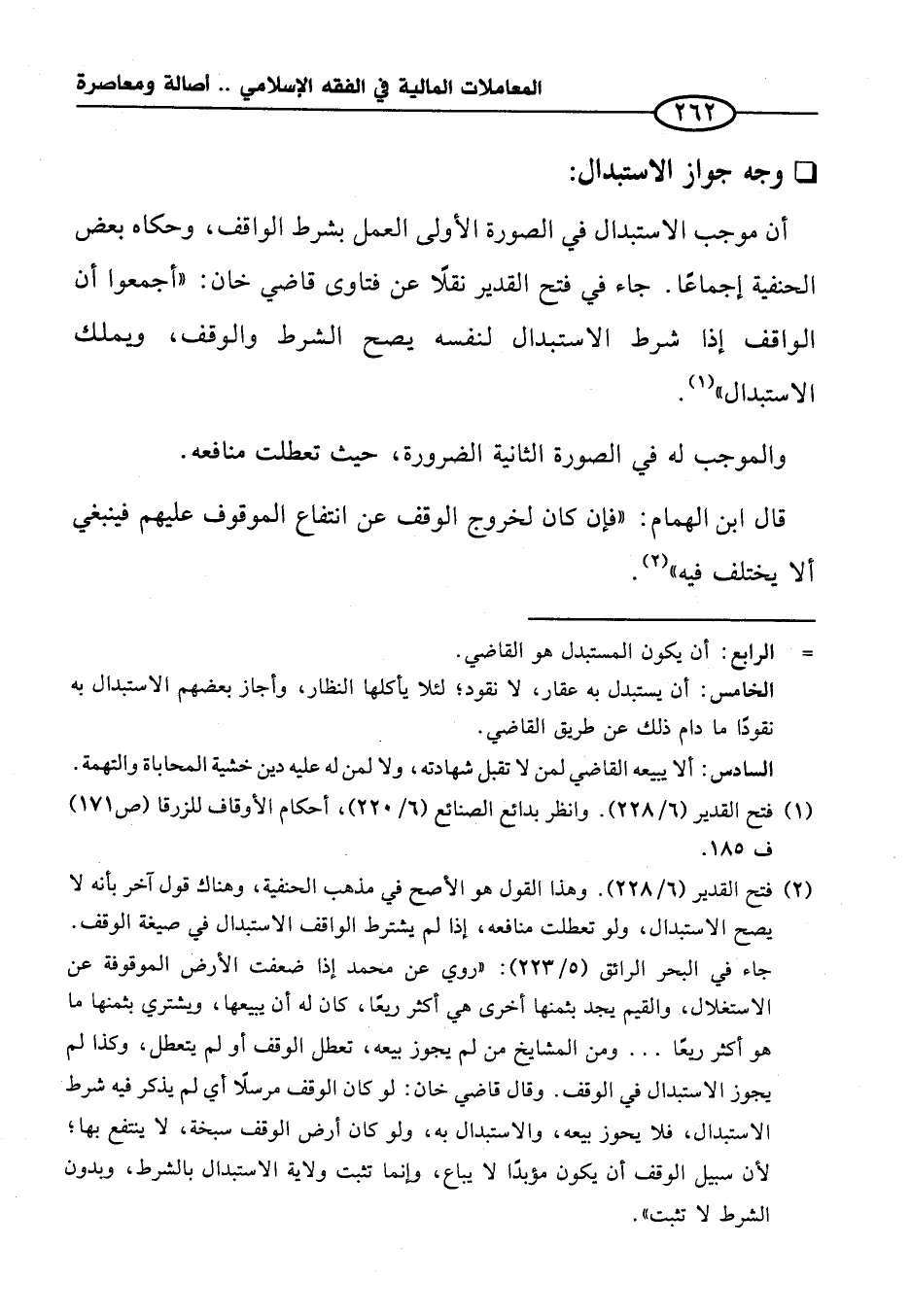 (¬٢) فتح القدير (٦/ ٢٢٨). وهذا القول هو الأصح في مذهب الحنفية، وهناك قول آخر بأنه لا يصح الاستبدال، ولو تعطلت منافعه، إذا لم يشترط الواقف الاستبدال في صيغة الوقف.