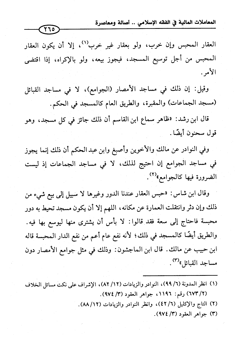 وقال ابن شاس: "حبس العقار عندنا الدور وغيرها لا سبيل إلى بيع شيء من ذلك وإن دثر وانتقلت العمارة عن مكانه، اللهم إلا أن يكون مسجد تحيط به دور محبسة فاحتاج إلى سعة فقد. قالوا: لا بأس أن يشترى منها ليوسع بها فيه. والطريق أيضًا كالمسجد في ذلك؛ لأنه نفع عام أعم من نفع الدار المحبسة قاله ابن حبيب عن مالك. قال ابن الماجشون: وذلك في مثل جوامع الأمصار دون مساجد القبائل" (¬٣).