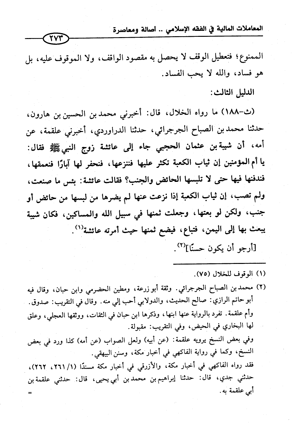 (ث -١٨٨) ما رواه الخلال، قال: أخبرني محمَّد بن الحسين بن هارون، حدثنا محمَّد بن الصباح الجرجرائي، حدثنا الدراوردي، أخبرني علقمة، عن أمه، أن شيبة بن عثمان الحجبي جاء إلى عائشة زوج النبي - صلى الله عليه وسلم - فقال: يا أم المؤمنين إن ثياب الكعبة تكثر عليها فننزعها، فنحفر لها آبارًا فنعمقها، فندفنها فيها حتى لا تلبسها الحائض والجنب؟ فقالت عائشة: بئس ما صنعت، ولم تصب، إن ثياب الكعبة إذا نزعت عنها لم يضرها من لبسها من حائض أو جنب، ولكن لو بعتها، وجعلت ثمنها في سبيل الله والمساكين، فكان شيبة يبعث بها إلى اليمن، فتباع، فيضع ثمنها حيث أمرته عائشة (¬١).