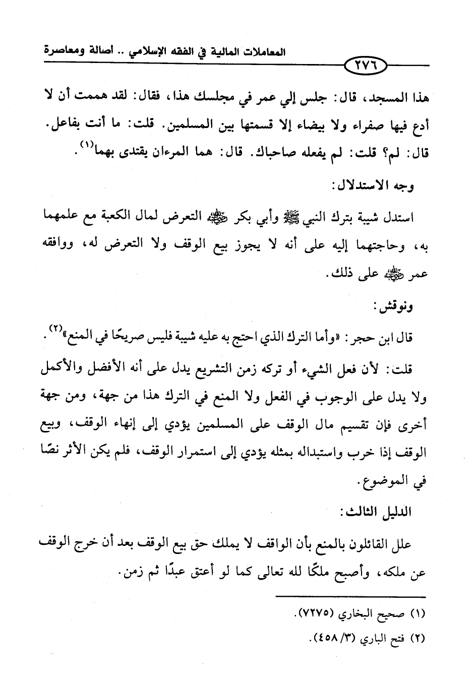 قلت: لأن فعل الشيء أو تركه زمن التشريع يدل على أنه الأفضل والأكمل ولا يدل على الوجوب في الفعل ولا المنع في الترك هذا من جهة، ومن جهة أخرى فإن تقسيم مال الوقف على المسلمين يؤدي إلى إنهاء الوقف، وبيع الوقف إذا خرب واستبداله بمثله يؤدي إلى استمرار الوقف، فلم يكن الأثر نصًا في الموضوع.