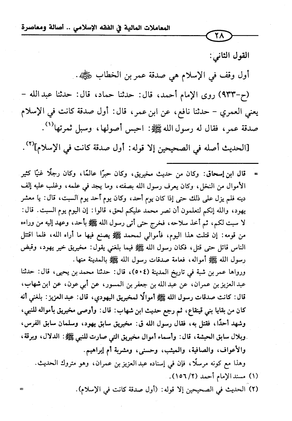 (ح -٩٣٣) روى الإمام أحمد، قال: حدثنا حماد، قال: حدثنا عبد الله -يعني العمري- حدثنا نافع، عن ابن عمر، قال: أول صدقة كانت في الإسلام صدقة عمر، فقال له رسول الله - صلى الله عليه وسلم -: احبس أصولها، وسبل ثمرتها (¬١).