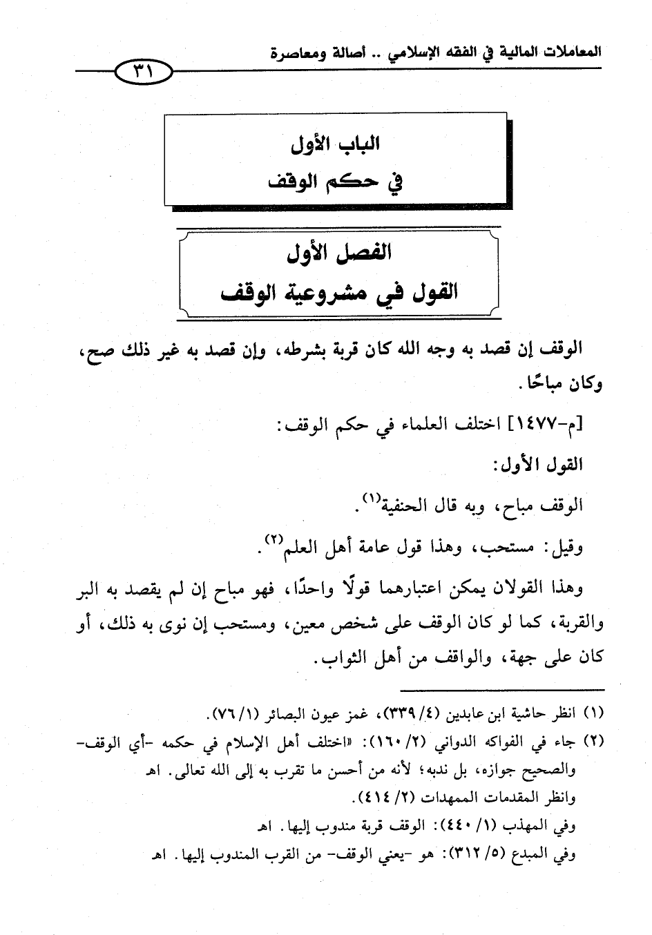 (¬٢) جاء في الفواكه الدواني (٢/ ١٦٠): "اختلف أهل الإسلام في حكمه -أي الوقف- والصحيح جوازه، بل ندبه؛ لأنه من أحسن ما تقرب به إلى الله تعالى. اهـ