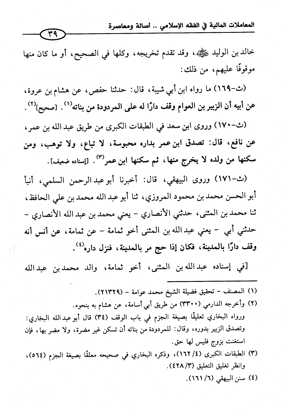 (ث -١٦٩) ما رواه ابن أبي شيبة، قال: حدثنا حفص، عن هشام بن عروة، عن أبيه أن الزبير بن العوام وقف دارًا له على المردودة من بناته (¬١). [صحيح] (¬٢).