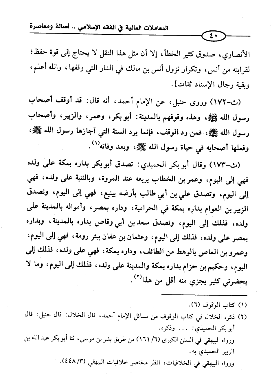 (ث -١٧٢) وروى حنبل، عن الإمام أحمد، أنه قال: قد أوقف أصحاب رسول الله - صلى الله عليه وسلم -، وهذه وقوفهم بالمدينة: أبو بكر، وعمر، والزبير، وأصحاب رسول الله - صلى الله عليه وسلم -، فمن رد الوقف، فإنما يرد السنة التي أجازها رسول الله - صلى الله عليه وسلم -، وفعلها أصحابه في حياة رسول الله - صلى الله عليه وسلم -، وبعد وفاته (¬١).