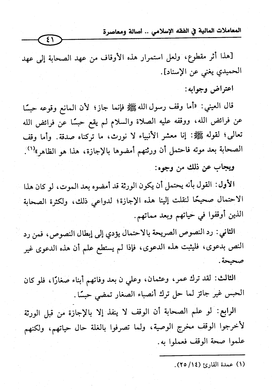 قال العيني: "أما وقف رسول الله - صلى الله عليه وسلم - فإنما جاز؛ لأن المانع وقوعه حبسًا عن فرائض الله، ووقفه عليه الصلاة والسلام لم يقع حبسًا عن فرائض الله تعالى؛ لقوله - صلى الله عليه وسلم -: إنا معشر الأنبياء لا نورث، ما تركناه صدقة. وأما وقف الصحابة بعد موته فاحتمل أن ورثتهم أمضوها بالإجازة، هذا هو الظاهر" (¬١).