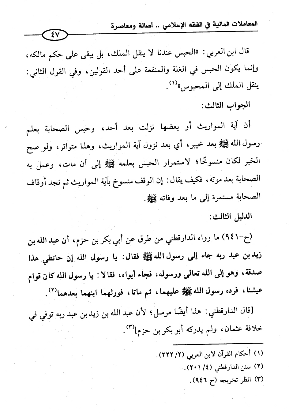أن آية المواريث أو بعضها نزلت بعد أحد، وحبس الصحابة بعلم رسول الله - صلى الله عليه وسلم - بعد خيبر، أي بعد نزول آية المواريث، وهذا متواتر، ولو صح الخبر لكان منسوخًا؛ لاستمرار الحبس بعلمه - صلى الله عليه وسلم - إلى أن مات، وعمل به الصحابة بعد موته، فكيف يقال: إن الوقف منسوخ بآية المواريث ثم نجد أوقاف الصحابة مستمرة إلى ما بعد وفاته - صلى الله عليه وسلم -.