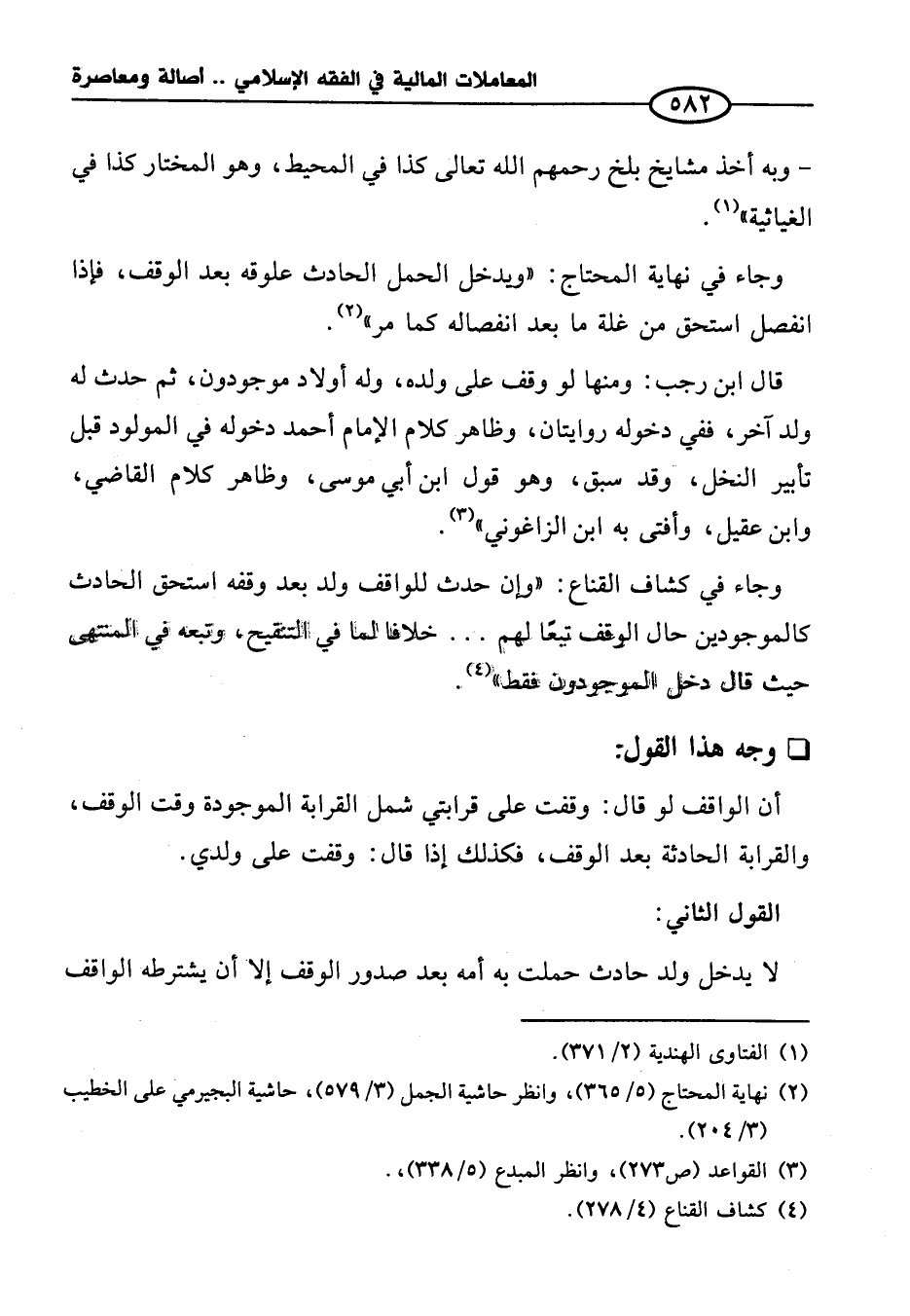 وجاء في كشاف القناع: "وإن حدث للواقف ولد بعد وقفه استحق الحادث كالموجودين حال الوقف تبعًا لهم ... خلافًا لما في التنقيح، وتبعه في المنتهى حيث قال دخل الموجودن فقط" (¬٤).