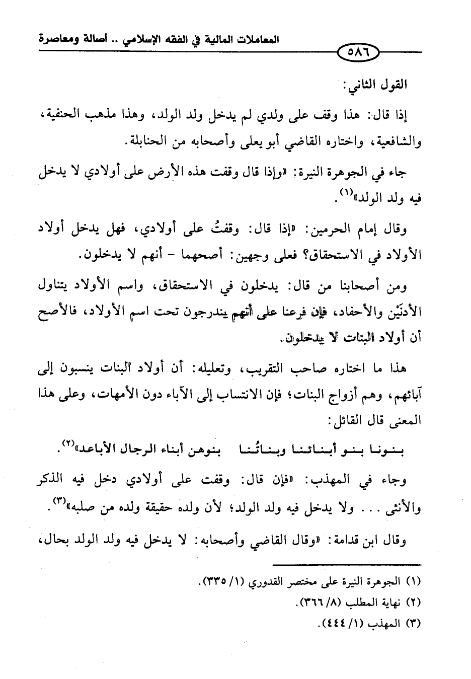جاء في الجوهرة النيرة: "وإذا قال وقفت هذه الأرض على أولادي لا يدخل فيه ولد الولد" (¬١).