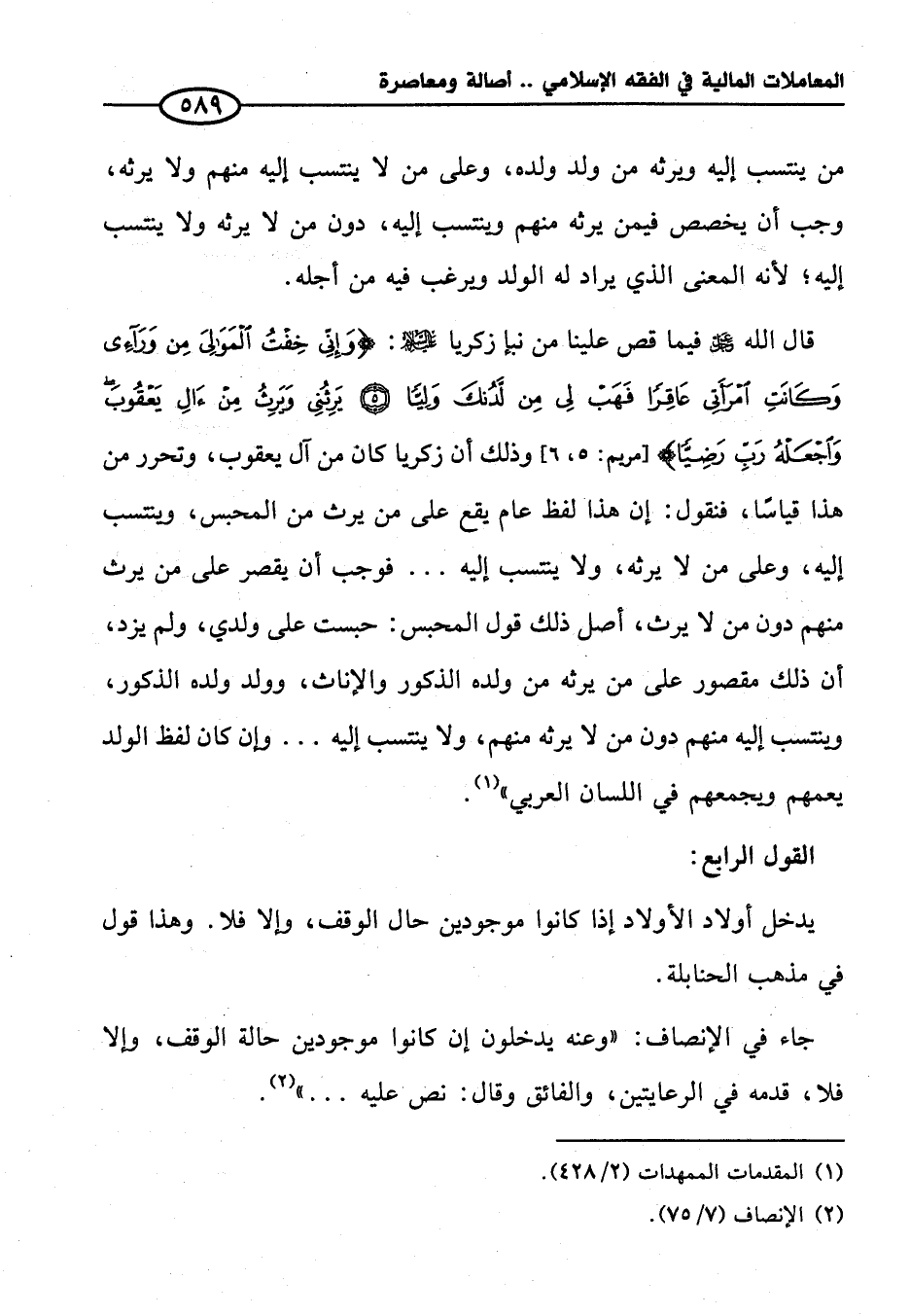 قال الله عَزَّ وَجَلَّ فيما قص علينا من نبإ زكريا عليه السلام: {وَإِنِّي خِفْتُ الْمَوَالِيَ مِنْ وَرَائِي وَكَانَتِ امْرَأَتِي عَاقِرًا فَهَبْ لِي مِنْ لَدُنْكَ وَلِيًّا (٥) يَرِثُنِي وَيَرِثُ مِنْ آلِ يَعْقُوبَ وَاجْعَلْهُ رَبِّ رَضِيًّا} [مريم: ٥، ٦] وذلك أن زكريا كان من آل يعقوب، وتحرر من هذا قياسًا، فنقول: إن هذا لفظ عام يقع على من يرث من المحبس، وينتسب إليه، وعلى من لا يرثه، ولا ينتسب إليه ... قوجب أن يقصر على من يرث منهم دون من لا يرث، أصل ذلك قول المحبس: حبست على ولدي، ولم يزد، أن ذلك مقصور على من يرثه من ولده المذكور والإناث، وولد ولده المذكور، وينتسب إليه منهم دون من لا يرثه منهم، ولا ينتسب إليه ... وإن كان لفظ الولد يعمهم ويجمعهم في اللسان العربي" (¬١).
