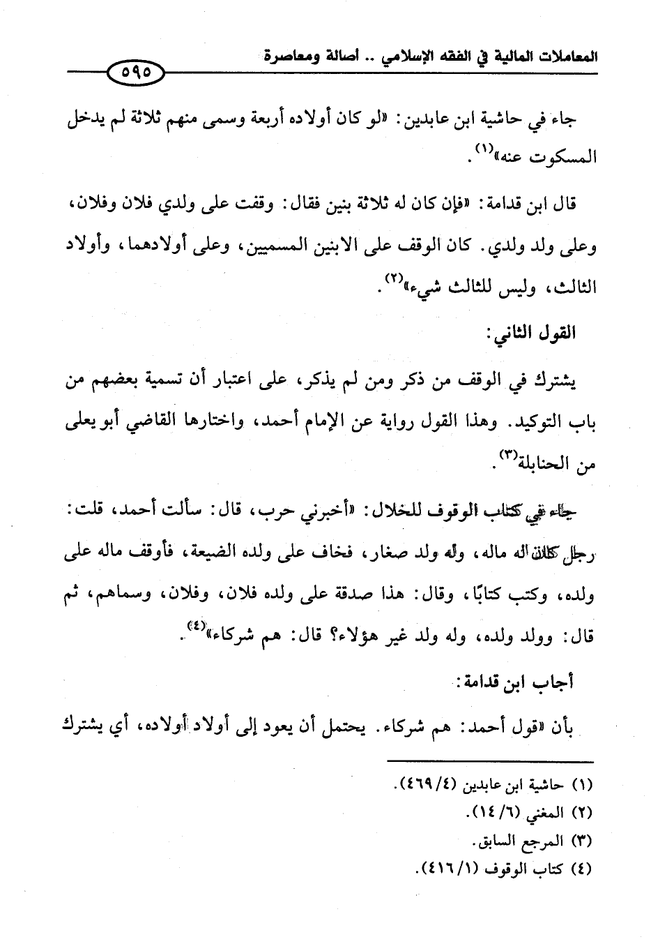 جاء في كتاب الوقوف للخلال: "أخبرني حرب، قال: سألت أحمد، قلت: رجل كان له ماله، وله ولد صغار، فخاف على ولده الضيعة، فأوقف ماله على ولده، وكتب كتابًا، وقال: هذا صدقة على ولده فلان، وفلان، وسماهم، ثم قال: وولد ولده، وله ولد غير هؤلاء؟ قال: هم شركاء" (¬٤).