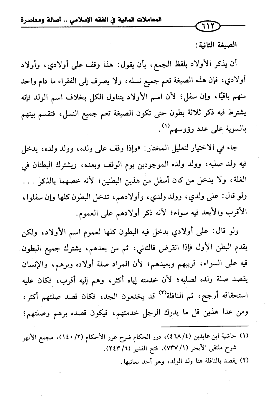 أن يذكر الأولاد بلفظ الجمع، بأن يقول: هذا وقف على أولادي، وأولاد أولادي، فإن هذه الصيغة تعم جميع نسله، ولا يصرف إلى الفقراء ما دام واحد منهم باقيًا، وإن سفل؛ لأن اسم الأولاد يتناول الكل بخلاف اسم الولد فإنه يشترط فيه ذكر ثلاثة بطون حتى تكون الصيغة تعم جميع النسل، فتقسم بينهم بالسوية على عدد رؤوسهم (¬١).