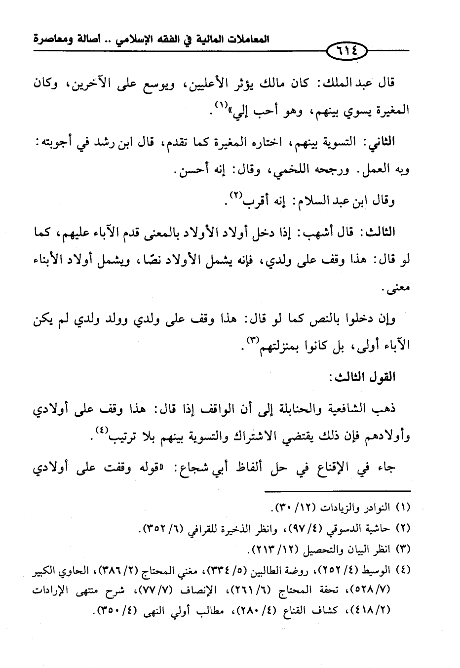 ذهب الشافعية والحنابلة إلى أن الواقف إذا قال: هذا وقف على أولادي وأولادهم فإن ذلك يقتضي الاشتراك والتسوية بينهم بلا ترتيب (¬٤).