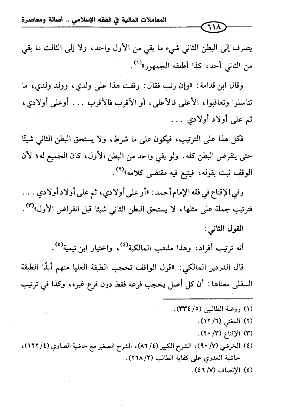 وفي الإقناع في فقه الإِمام أحمد: "أو على أولادي، ثم على أولاد أولادي ... فترتيب جملة على مثلها، لا يستحق البطن الثاني شيئاً قبل انقراض الأول" (¬٣).