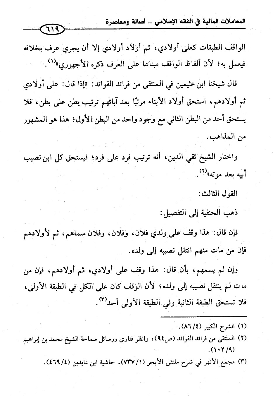 قال شيخنا ابن عثيمين في المنتقى من فرائد الفوائد: "إذا قال: على أولادي ثم أولادهم، استحق أولاد الأبناء مرتبًا بعد آبائهم ترتيب بطن على بطن، فلا يستحق أحد من البطن الثاني مع وجود واحد من البطن الأول؛ هذا هو المشهور من المذاهب.